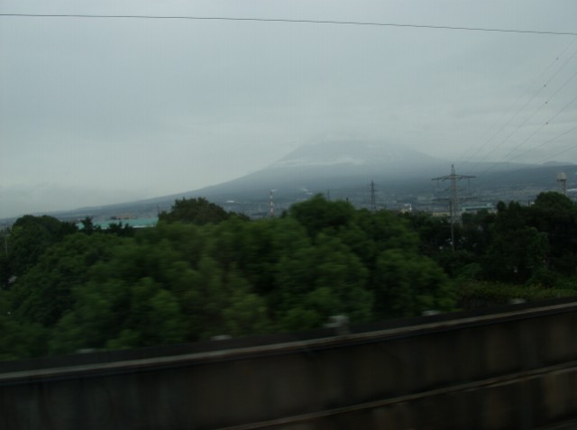 Our first sight of Fuji-san... shrouded in clouds. Maybe it's just low cloud and we can drive above it...