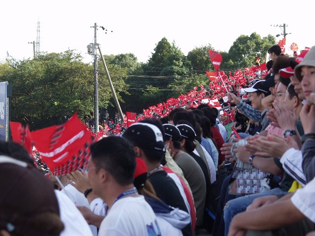 Everyone has been dished out with Bridgestone flags to turn the 130,000 crowd into a sea of red.