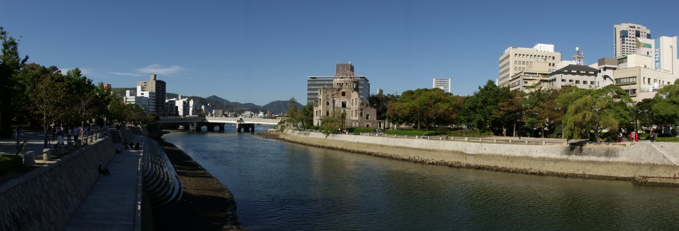 The A-Bomb Dome. Panorama view from across the river. Scroll this way ->