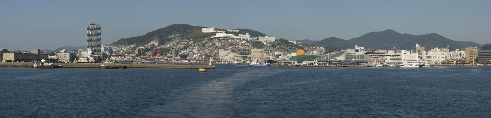 Panorama of Nagasaki harbour from the water. Scroll this way ->