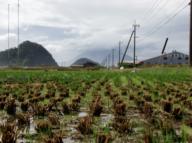 Rice fields in front of Sakurajima.