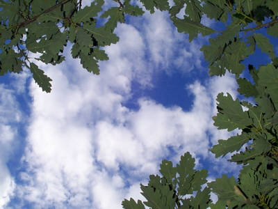 Kodak DC120 I took this one at a local park while waiting for a time-lapse video of the sky to complete. The oak leaves look as though they have been put in afterwards as part of a digital montage but the photo is as was taken. I took it under the tree and forced the flash to fire to illuminate the leaves. I didn't guess at the time just how brightly they'd be lit up – I was pleasantly surprised.